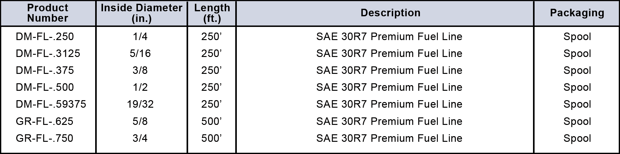 Designed to carry most modern fuels in cars, trucks, buses, etc.  Handles temperature ranges of -40 to +257 Degrees F.  Withstands oil, grease, abrasion and ozone.  An excellent product for all diesel based fuels.  Meets or exceeds the burst requirements of the SAE30R7 specification.